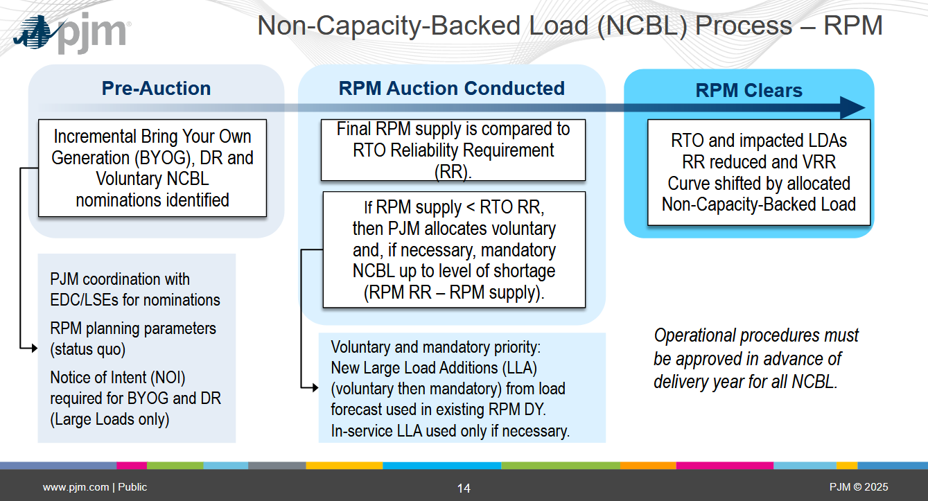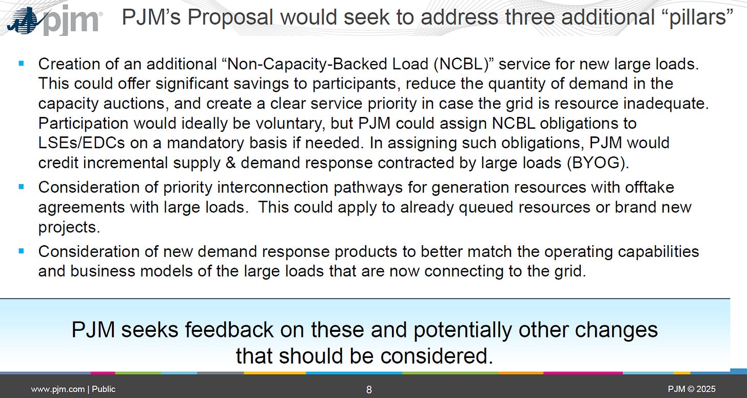 PJM itself, however, framed BYOG differently. In its August 18 proposal, BYOG was presented as an offset within the Non-Capacity-Backed Load (NCBL) construct, not as a stand-alone mandate. NCBL would begin as a voluntary option, with the possibility of mandatory assignment only if PJM faced a supply shortfall.