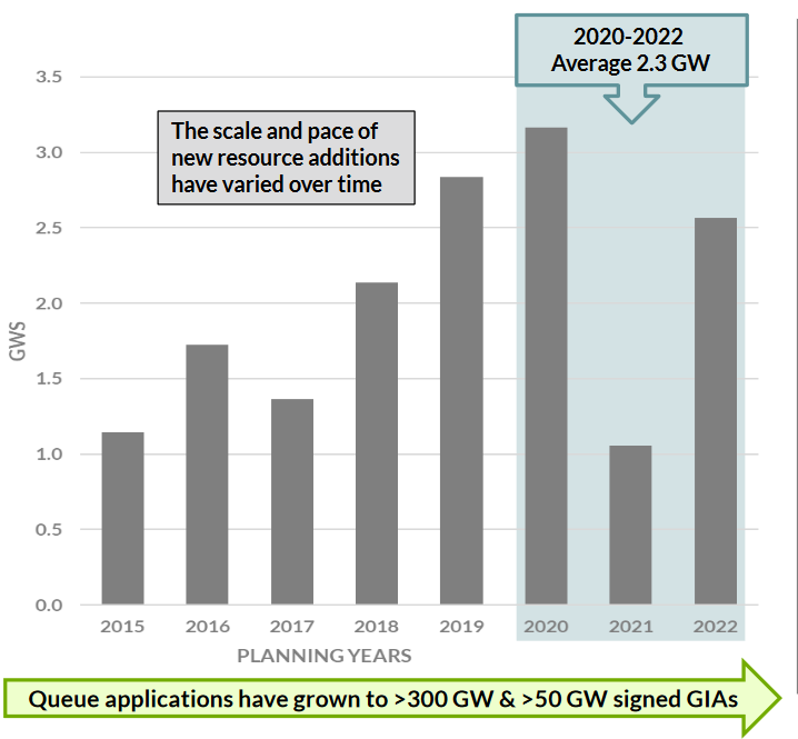 Don’t get fooled by the potential new capacity addition scenarios of 2.3 GW/yr and 6.1 GW/yr. MISO says generator interconnection capacity is not being built even though generators have signed an interconnection agreement. The chart below shows that, on average, only 2.3 GW was built during the COVID years (2020-2022). For 50 GW of signed interconnection agreements, MISO is only counting 2.3 GW. That’s only 4% of signed GIAs.